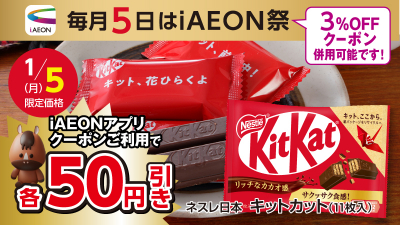 - 1月のiAEON祭は、ネスレ日本の「キットカット(11枚入)」にご注目!iAEONアプリクーポンご利用でな、なんと50円引きに!!