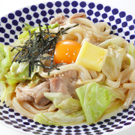 キャベツ 40g 豚ロースしゃぶしゃぶ用 50g うどん 1玉 あまうまいだししょうゆ 大さじ2と1/2 卵黄 1個 バター 10g のり(刻み) 適量 白ごま 適量