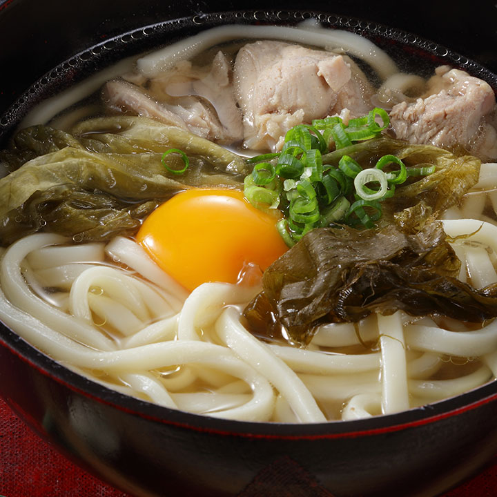 小鍋にうどん出汁を温める。とり肉をを入れて火を通す。