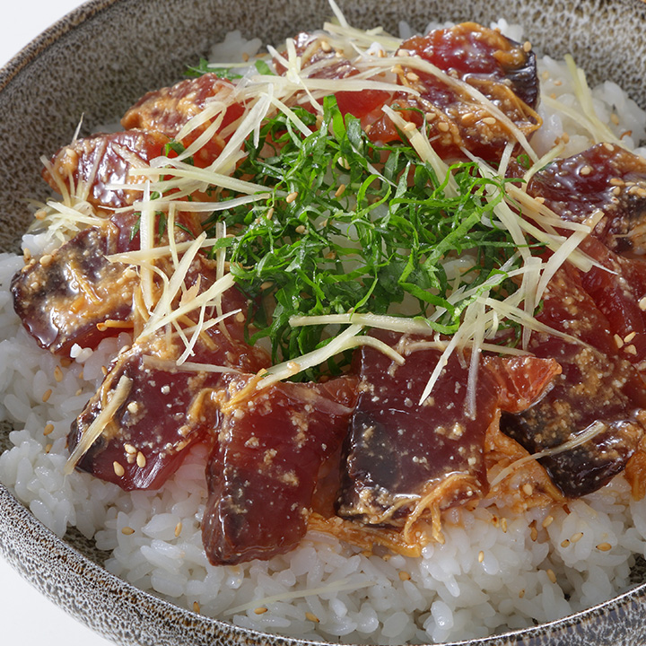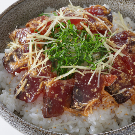 生しょうゆ糀 大さじ1 かつお(刺身用) 120g しょうが 1/2片 ご飯 2膳分(300g) すし酢 大さじ1~2 いりごま 小さじ1 青じそ 4枚