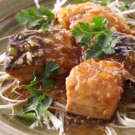 さば(切り身)2切れ ねぎ 1/2本 しょうが 1/2片 にんにく 1/2片 小麦粉 適量 揚げ油 適量 サラダ油 大さじ1/2 片栗粉 大さじ1/2 パクチー 少々