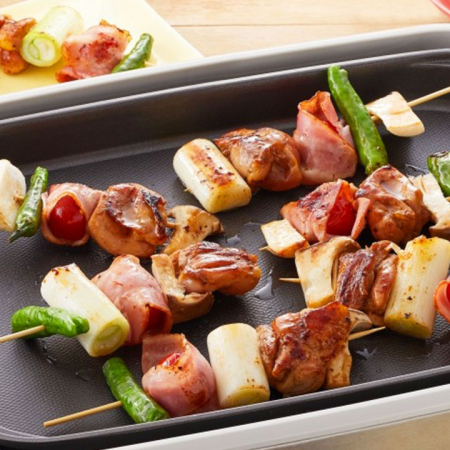 鶏もも肉(皮つき) 小2枚(400g) 「CookDo」回鍋肉用3〜4人前 1箱 長ねぎ・白い部分 1本 ベーコン 4枚 ミニトマト 8個 ししとうがらし 8本 エリンギ 2本 「AJINO叩TOサラダ油」 大さじ1/2
