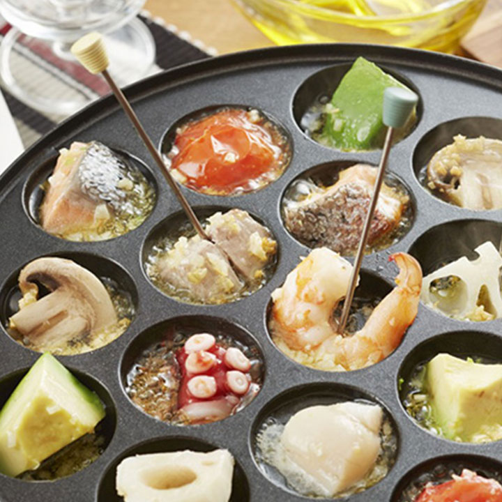 むきえび 8尾 ゆでだこ 100g 帆立貝柱 4個 生ざけ 1切れ まぐろ(剌身用) 100g マッシュルーム 4個 アボカド 1/2個 れんこん 小1節 にんにく(みじん切り) 大さじ4 「AJINOMOTO オリーブオイルJ カップ1/2 塩 適量 粗挽き黒こしょう 適量