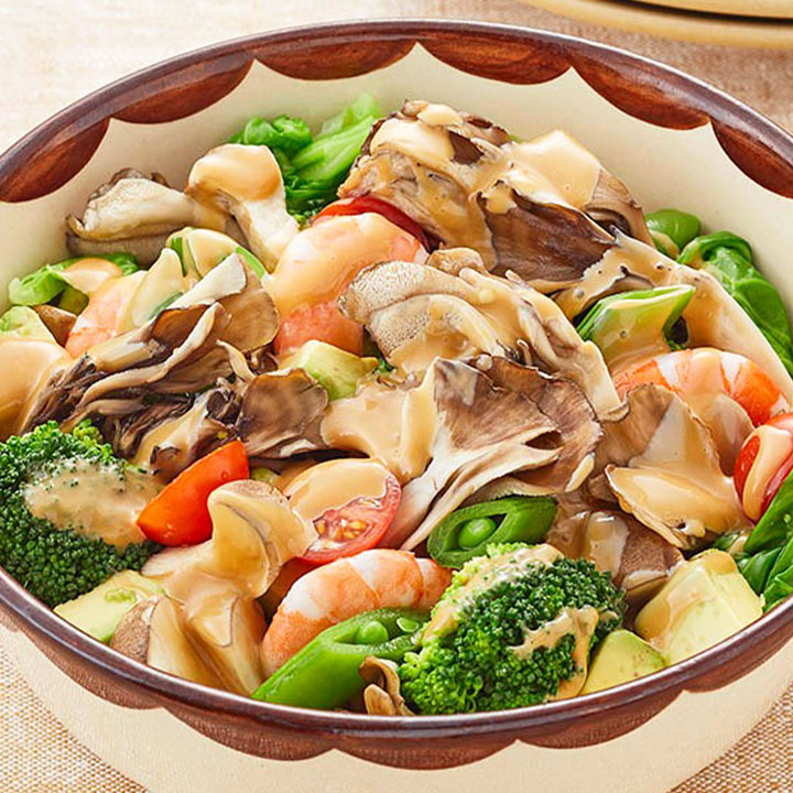 まいたけ 1パック エリンギ 1パック ブロッコリー 1/2個(100g) キャベツ 2枚(100g) スナップえんどう 6本 アボカド 1個 ミニトマト 4個 ゆでえび 4尾