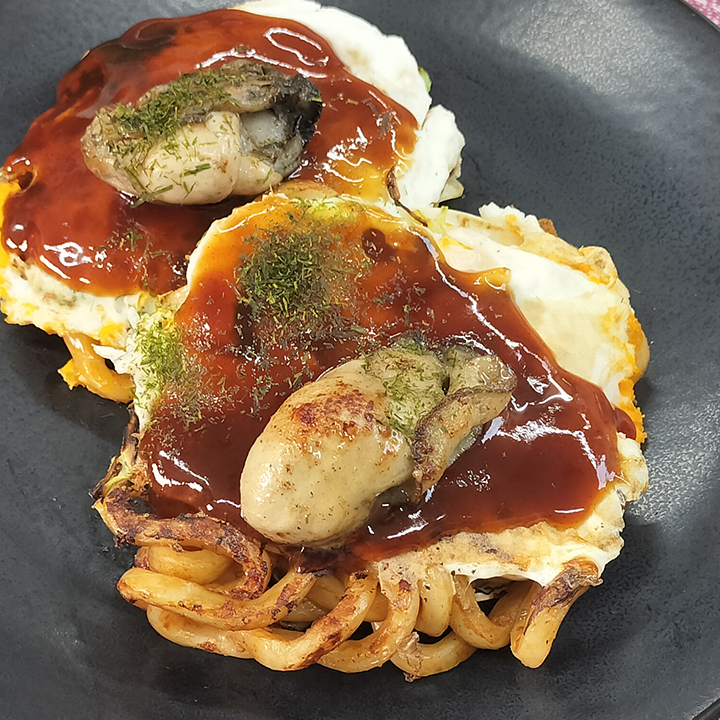豚バラ肉 3枚 キャベツ(せん切り) 120g たまご 3個 もやし 15g うどん 1玉 青ねぎ(小口切り) 6g かつおぶし 3g 餃子の皮(大判) 3枚 牡蠣 3粒 オリーブオイル 適量 オタフクお好みソース 適量 オタフク焼そばソース 適量 特製いか天入り天かす天華 適量
