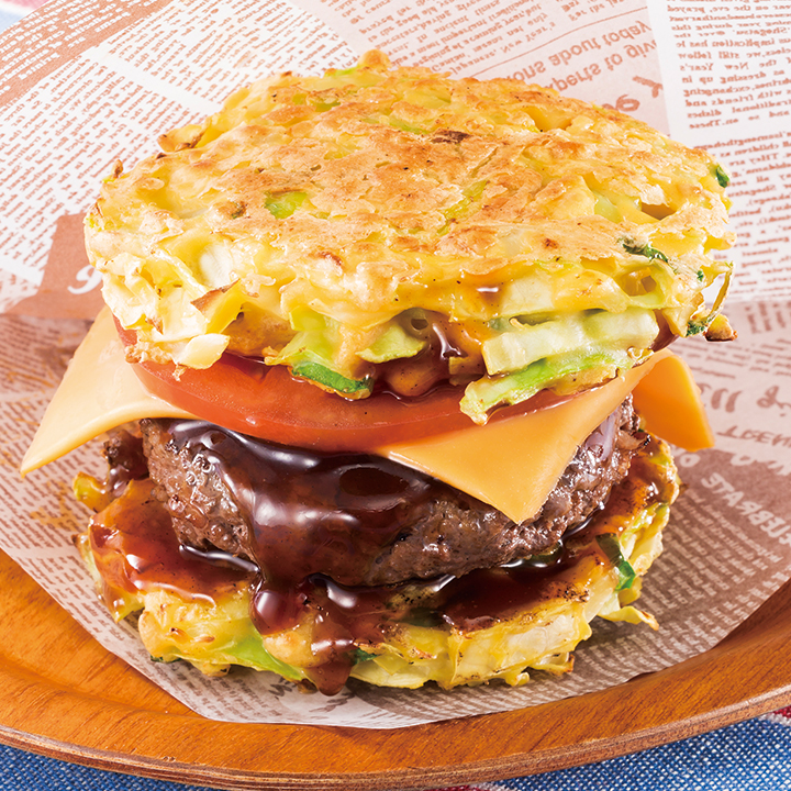 キャベツ(粗みじん切り) 300g 青ねぎ(小口切り) 10g 豚バラ肉 6枚 トマト(輪切り) 2枚 キャベツ(千切り) 30g 牛ひき肉 160g 卵 2個 スライスチーズ 2枚 塩・こしょう 適量 水 150ml オタフクお好み焼こだわりセット 2人前 オタフクお好みソース 適量