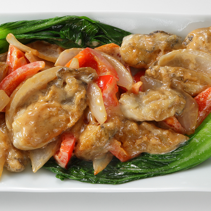 かき(むき身) 10粒 玉ねぎ 1/2個 パプリカ(赤) 1/2個 チンゲン菜(ゆで) 1/2株 片栗粉 大さじ1 調合油 大さじ1